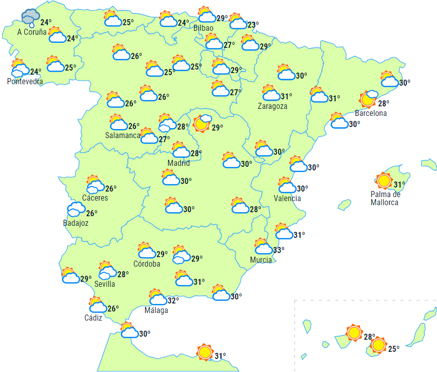 Varsler om meget høje temperaturer på den sydøstlige og nordøstlige tredjedel af halvøen, Mallorca og De Kanariske Øer.