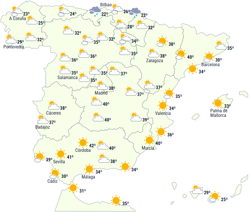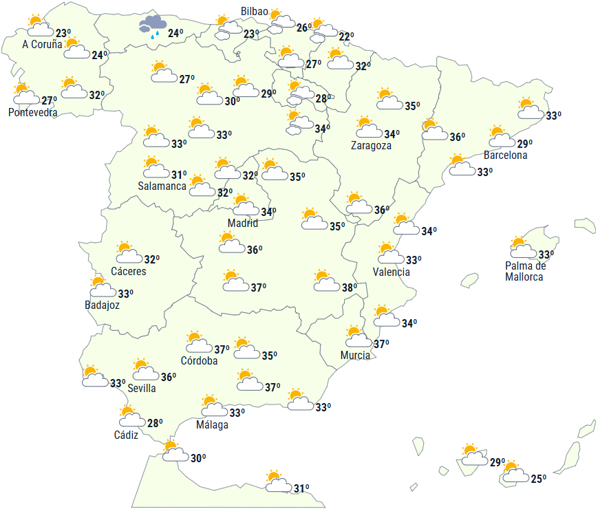 Der vil være over 35 grader på den sydlige halvdel af Den Iberiske Halvø, de nordøstlige dale samt på områder af De Baleariske Øer og De Kanariske Øer. Op til 40 grader i Guadalquivir-dalen og muligvis også i det nedre af Ebro-dalen samt indlandsområder i Murcia og Valencia.