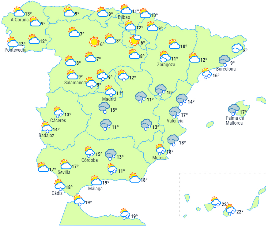 Skyet eller overskyet himmel med nedbør i den nordlige del af Galicien, det cantabriske område og halvøens Atlanterhavsområder. Nedbøren er svagere og mere spredt i starten, men vil intensiveres i løbet af eftermiddagen og aftenen.