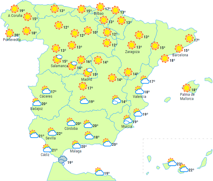 Der forventes fortsat stabilt vejr til det meste af halvøen med letskyet eller klar himmel, selvom der forventes lavthængende skyer om morgenen ved Middelhavskysterne, Gibraltarstrædet, den østlige ende af Det Cantabriske Hav, den øvre del af Ebro-dalen og i det vestlige Asturien.