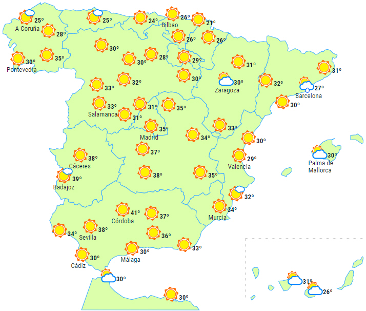 Der forventes stabilt vejr i det meste af landet med letskyet eller klar himmel, dog lavthængende morgenskyer helt i nord, som kan give tågebanker. Der forventes kun lidt ustabilitet i den østlige del af Catalonien og på Balearerne med overskyet himmel og sandsynlighed for byger og lejlighedsvise tordenbyger, men i løbet af dagens anden halvdel opklaring.