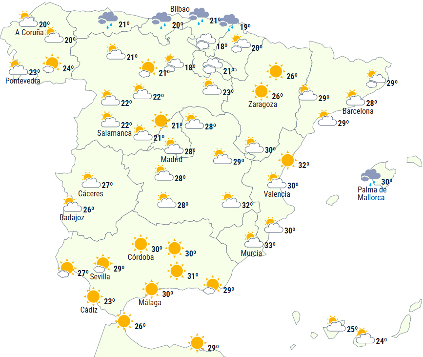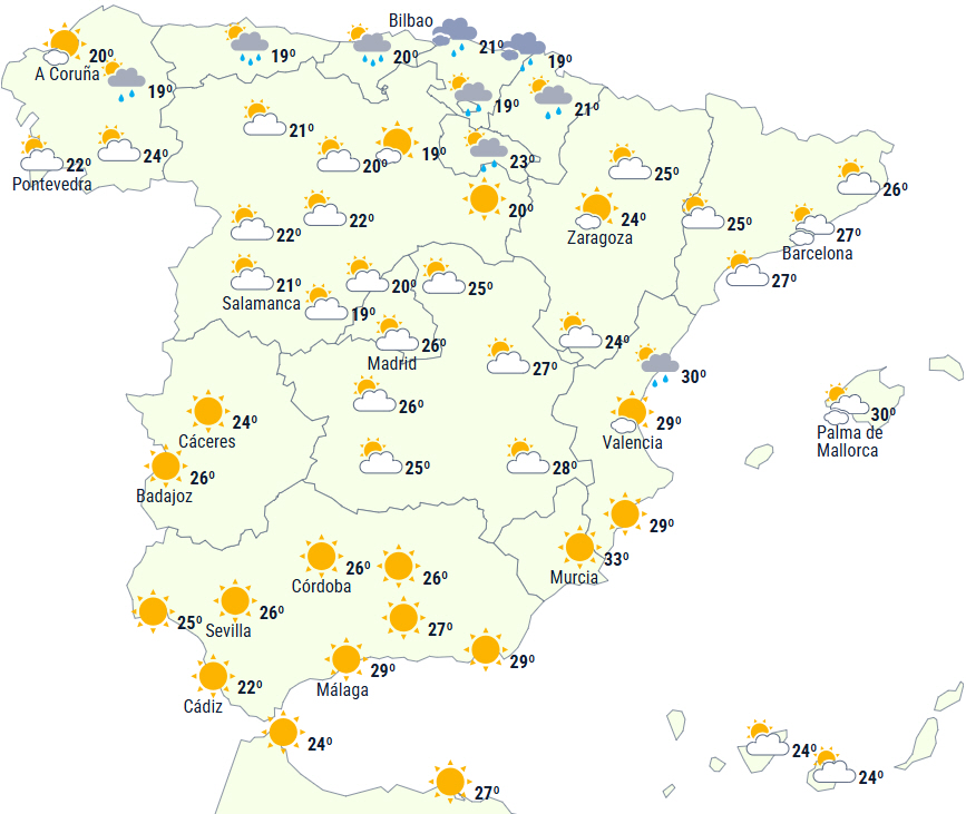 Dagstemperaturerne vil falde næsten overalt, bortset fra i Cantábrico, hvor der ikke ventes ændringer. Faldet vil være markant på den sydøstlige og østlige tredjedel. Alligevel vil temperaturen overstige 35 grader i Guadalquivir, sydøstlige dale og visse steder i nordøst samt på øgrupperne.