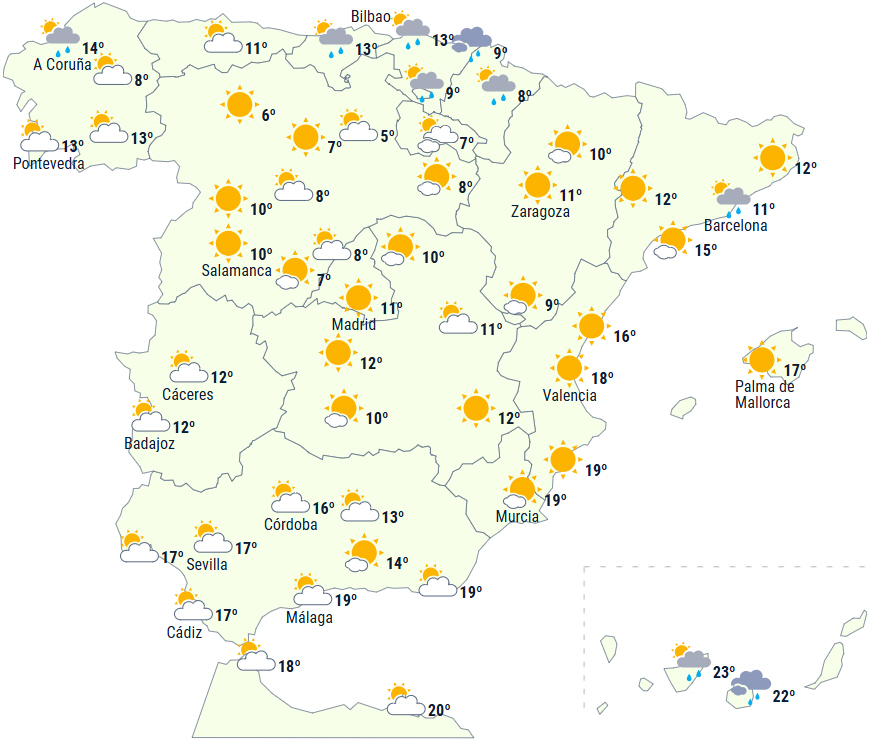 Rigeligt med skydække og nedbør til det meste af halvøen, men Alboran og østkysten ventes at slippe med højtliggende skyer i perioder. Der forventes mere rigelig nedbør i områderne langs Det Cantabriske Hav, i de vestlige Pyrenæer og Galicien, og der kan komme en god sjat på den vestlige halvdel af halvøen. Nedbøren falder som sne i de nordlige bjerge i højder over 2.000 meter i begyndelsen af dagen, men falder til omkring 1.000/1.200 meter undtagen i Pyrenæerne, hvor den falder helt ned til 700/900 meter, og der kan falde betydelige mængder i højderne i Cantabrien og Pyrenæerne.