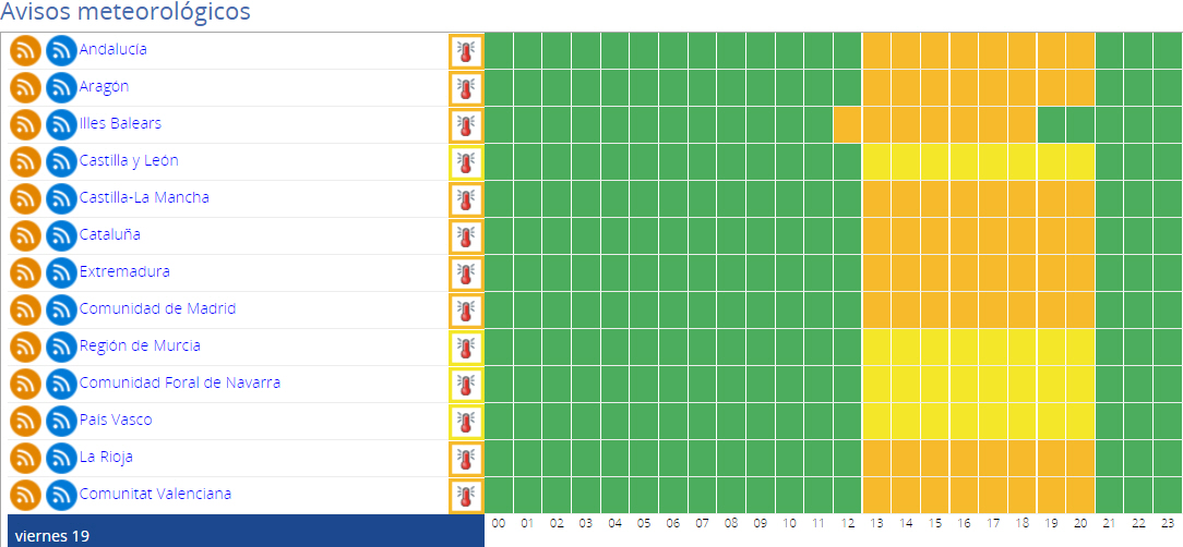 Temperaturerne fortsætter med at stige over næsten hele linjen, men mere markant i Middelhavsområderne og de indre egne af De Kanariske Øer. Temperaturerne vil overstige 36 grader i det nordlige højland, de indre dele af De Baleariske Øer og de sydlige dele af De Kanariske Øer. 38 til 40 grader i de indre områder af den sydlige halvdel og det nordøstlige af halvøen og endda 42 til 44 grader i dele af Guadalquivir.