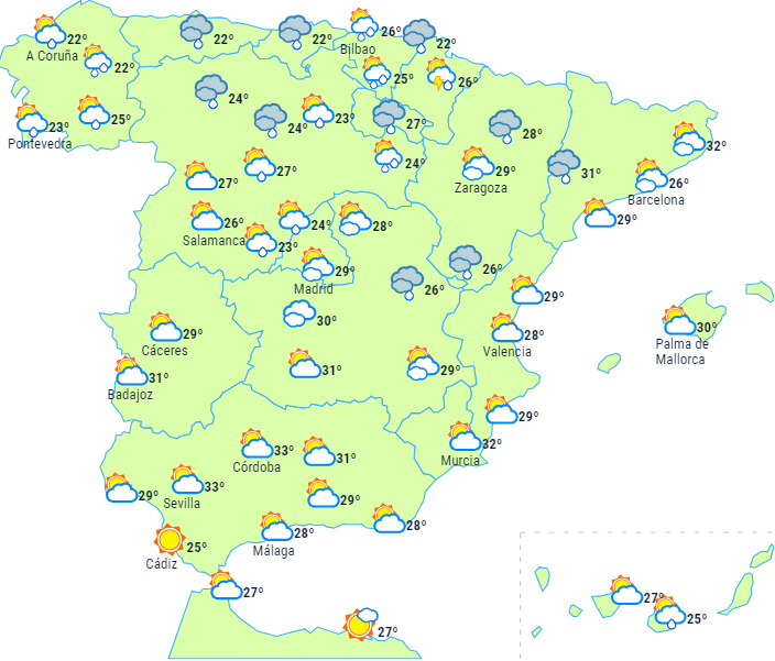 Nattemperaturer uden større ændringer. Dagstemperaturerne vil falde undtagen i Middelhavsområdet, den østlige ende af nordvestkysten og på De Baleariske Øer, hvor de vil stige. Temperaturerne kan nå op på 35 grader på det sydøstlige af halvøen og Mallorca.