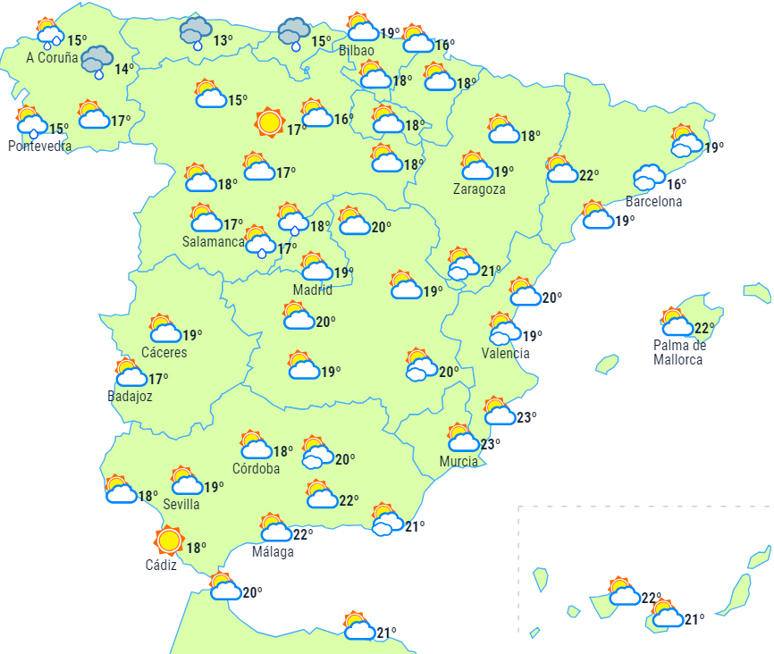 På halvøen og De Baleariske Øer forventes dagstemperaturerne at falde, men mere markant i det helt nordlige og Galicien. Undtagelsen vil være det sydlige højland, den sydlige del af det nordlige højland og den sydlige del af Aragón og Lleida, hvor de vil stige.