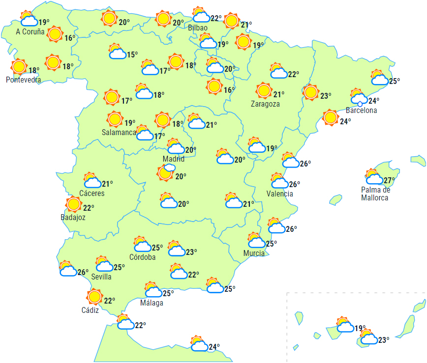 Letskyet på resten af halvøen med tiltagende skydække, som kan smide nogle svage byger af sig over det vestlige Cantabrien, De Iberiske Randbjerge, nordsiden af Pyrenæerne og de catalanske kyster.