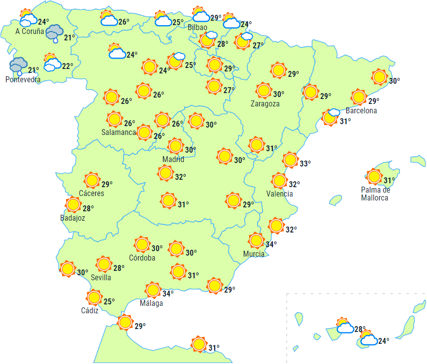 Dagstemperaturerne vil falde på den helt nordvestlige del af halvøen og stige på den nordøstlige tredjedel, mens der kun sker små ændringer i resten. Temperaturerne forventes at overstige 34-36 grader i det meste af halvøens sydlige indre halvdel samt i de indre egne i nordøst. Der advares dog om meget høje temperaturer i Málaga.