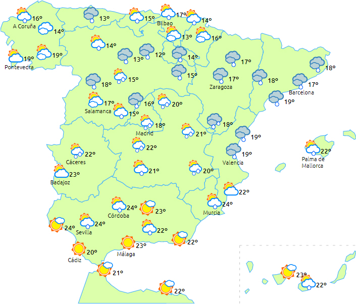 Skyet eller overskyet med let regn i det nordlige Galicien og Cantabrien. Også i den østlige halvdel af halvøen er der overskyet med byger og torden, som lokalt kan være kraftige i Pyrenæerne og i den sydøstlige halvdel.