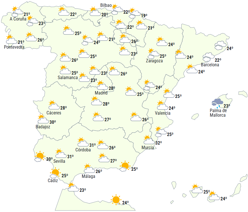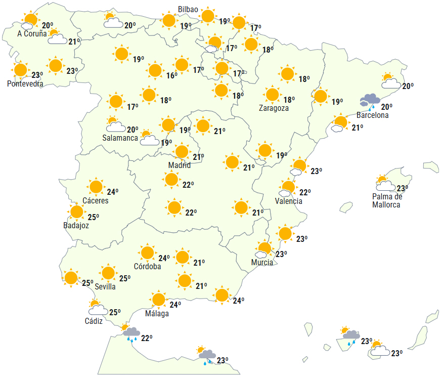 Ligeledes vil der i løbet af dagen udvikles skyer over den sydlige tredjedel, det østlige af fastlandet og på De Baleariske Øer, hvilket giver mulighed for svage og lejlighedsvis byger i bjergene i middelhavsforlandet. De kan brede sig i sidste del af dagen til Pyrenæerne og kysterne i Catalonien.