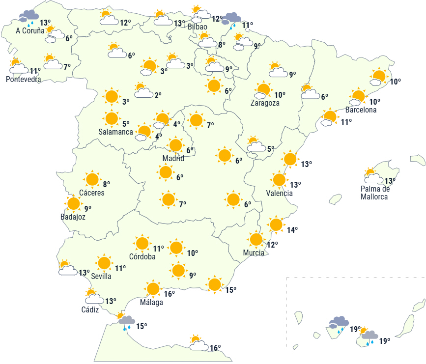 Der forventes overvejende stabilt vejr og letskyet himmel på halvøen og De Baleariske Øer. Kun længst mod nord forventes der mere overskyet himmel med nedbør, der påvirker det cantabriske område og Pyrenæerne og måske også den nordlige del af De Iberiske Bjerge.