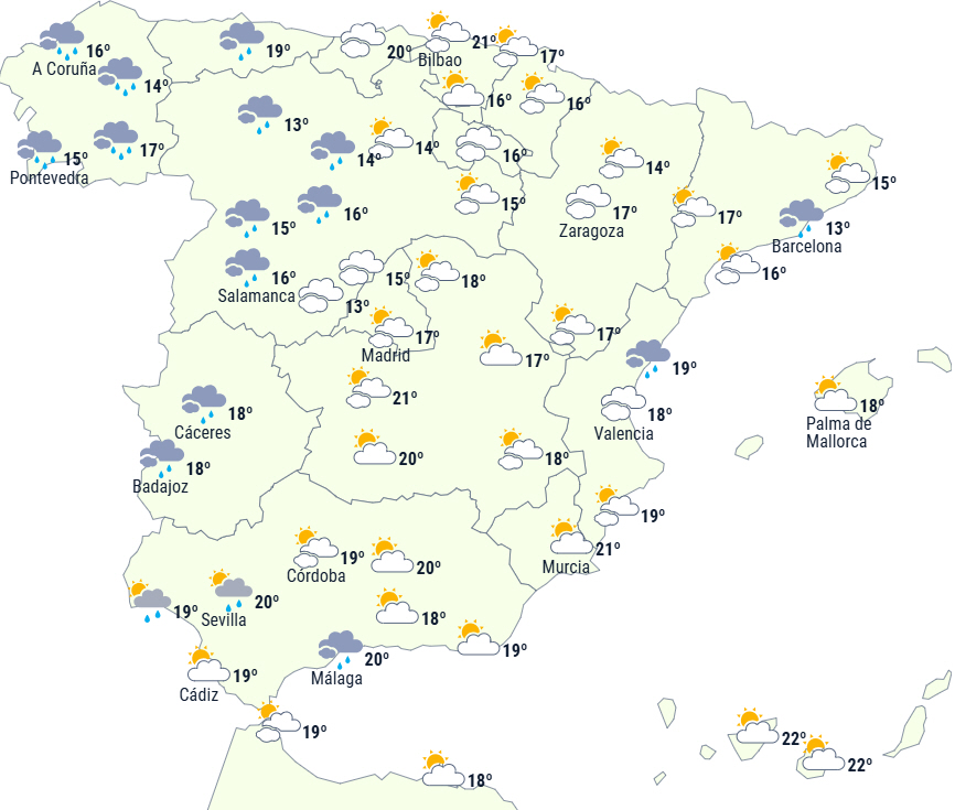 Lavthængende skydække om morgenen med mulig tåge og dis i den nordlige højslette, dalene på den sydlige del af Atlanterhavssiden og i nordøst, på Balearerne og den østlige del af halvøen, hvor skyerne vil være mere vedvarende og muligvis give svag regn ved Ampurdán.