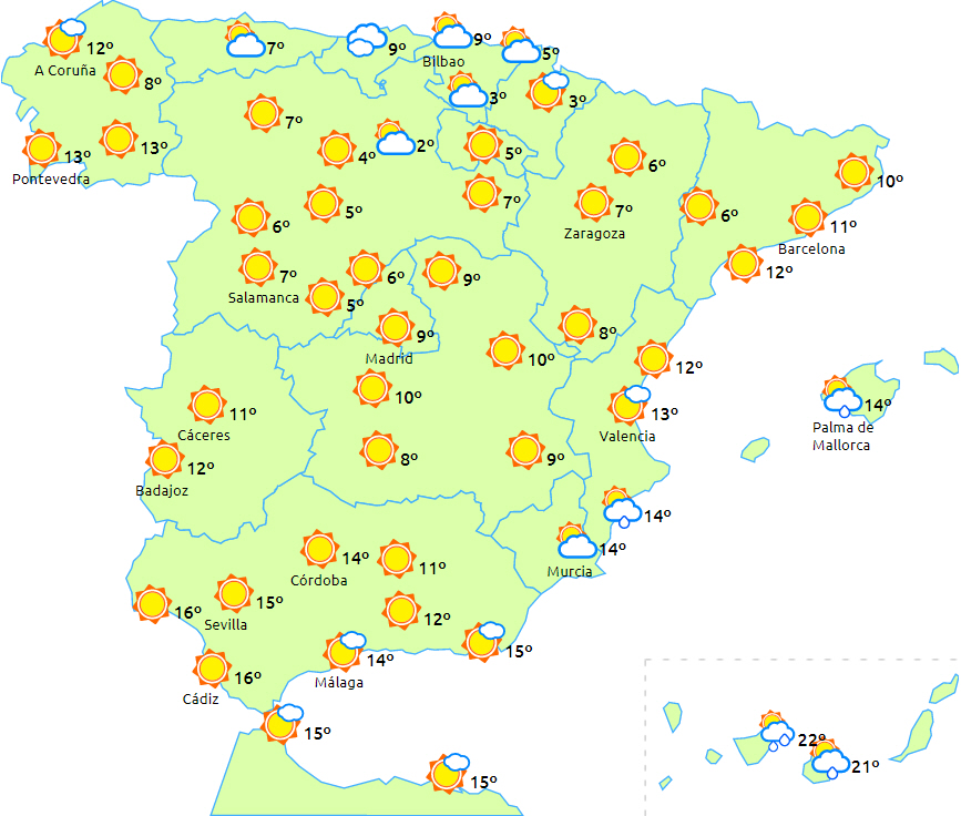 Frost til det meste af Galicien, den sydvestlige del af halvøen og det meste af halvøens indre egne undtagen i Ebro-dalen. Generelt vil temperaturerne ligge tæt på normalen for årstiden.