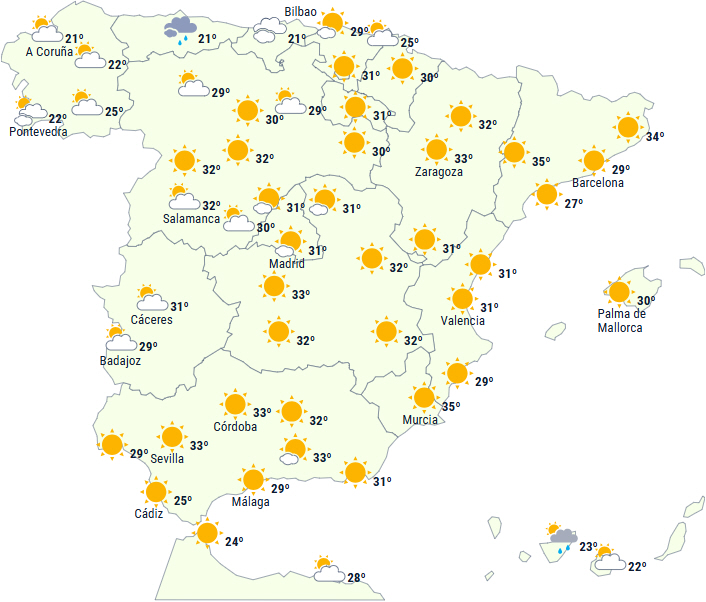 Dagstemperaturerne vil stige ved kysterne i Cantabrien, Cádiz-bugten samt på de østlige og nordøstlige egne af halvøen, mens de vil falde på den nordlige del af atlanterhavssiden, Gibraltarstrædet og det vestlige Alborán. Få ændringer i resten af landet. Det forventes at komme op på 34 til 36 grader på størstedelen af den sydlige halvdel og den nordøstlige del af Den Iberiske Halvø, samt i dele af det nordlige højland, dalene i nordvest og visse indlandsområder i Cantabrien. Det er sandsynligt, at temperaturen når helt op på 40 grader i de nordøstlige dale og store dele af den sydlige atlanterhavsside.