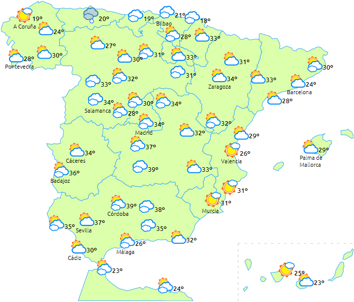 Overskyet over det meste af den nordlige del af halvøen med mulighed for byger eller tordenvejr. Resten af halvøen får letskyet til klar himmel, og der er ikke store chancer for nedbør. Letskyet på De Baleariske Øer.