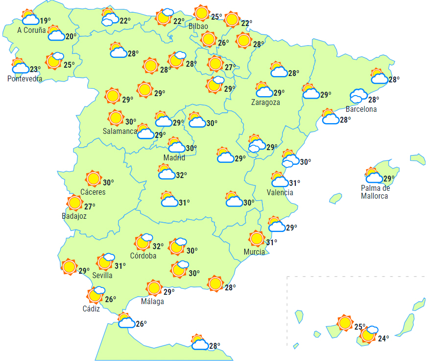 I det meste af landet forventes stabilt vejr med letskyet eller klar himmel. I den nordlige del af Galicien og det cantabriske område forventes dog overskyet himmel i perioder med lejlighedsvis let regn, der har tendens til at blive mindre i løbet af dagen.