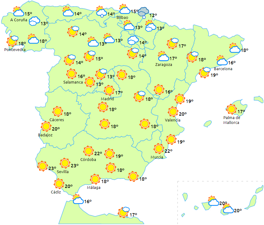 Der forventes tørt og solrigt vejr i det meste af landet med overvejende letskyet himmel. I den nordlige del af Galicien, Biscayabugten og Pyrenæerne er der dog udsigt til overskyet vejr med enkelte svage og spredte byger. Der kan være kraftigere byger i den nordlige del af Navarra.