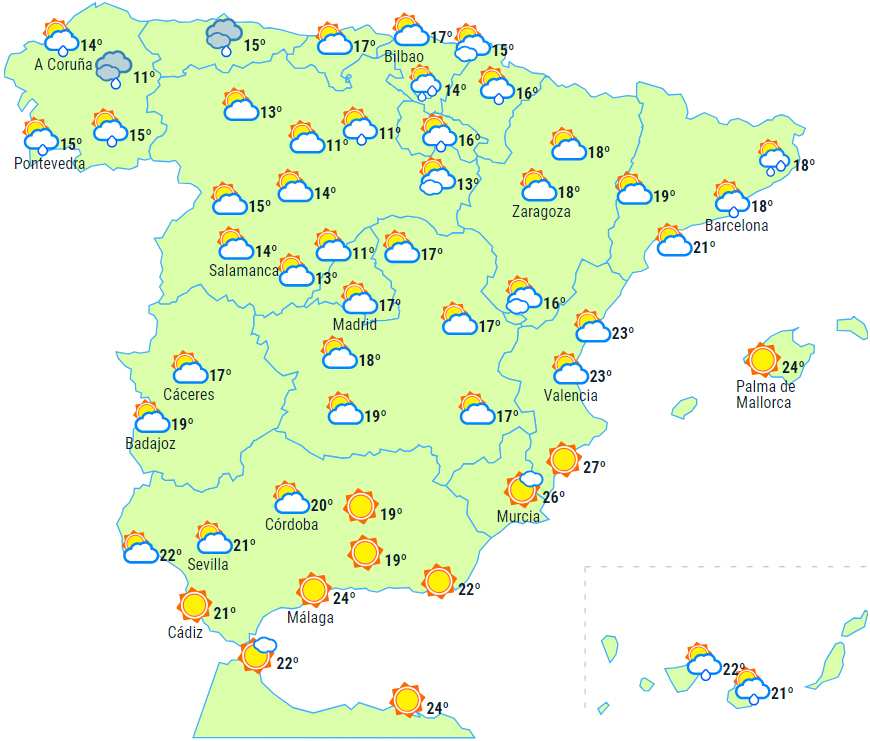 Der forventes også skyer over resten af halvøen og Balearerne.