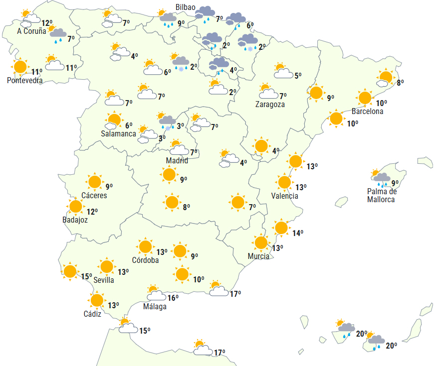 Arktisk luftmasse vil fortsat påvirke Den Iberiske Halvø og De Baleariske Øer med overskyet himmel over det nordlige af halvøen og øgruppen og nedbør til øerne, det cantabriske område, Pyrenæerne, Ebro-dalen, Den Iberiske Bjergkæde og det østlige af det nordlige højland. Det kan også i svagere grad nå andre steder på den nordlige tredjedel og bjergområder i centrum og sydøst.