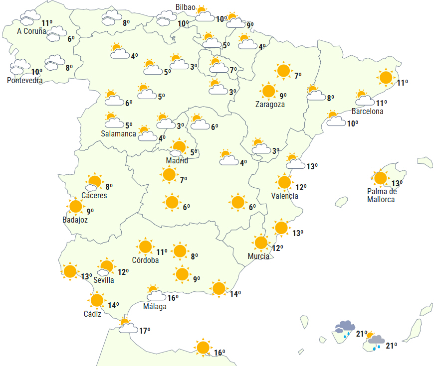 Frostgraderne vil brede sig og tage til, så der kan være tung frost i Pyrenæerne og moderat i de øvrige bjergområder på den nordlige halvdel og De Betiske Bjerge. Der ventes også svag frost i andre indlandsområder, især det nordlige højland.