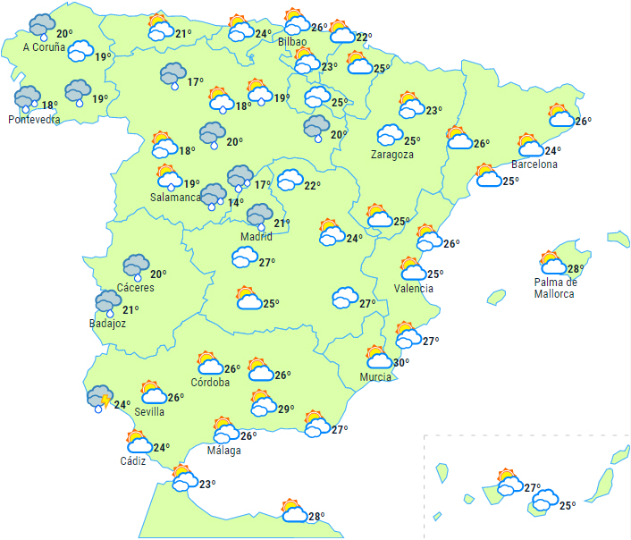 Varsler om lokalt kraftig eller vedvarende nedbør til dele af Galicien, de centrale bjerge, Pyrenæerne, Andalusien og Extremadura. Der advares også om perioder med kraftig vind i dagens første halvdel i Galicien og i bjergene på den nordlige tredjedel.