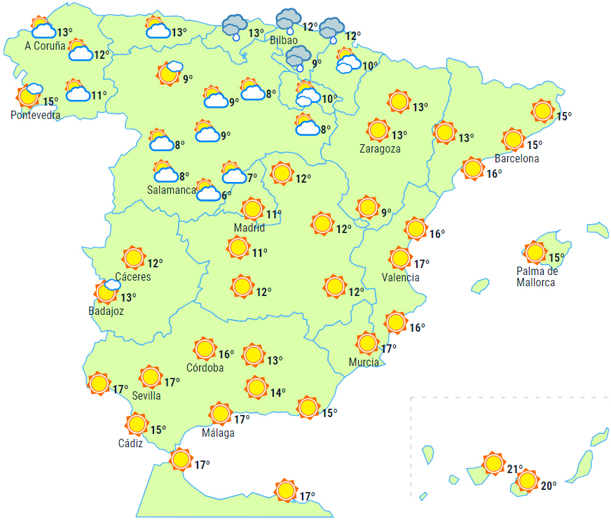 Dagstemperaturerne vil have tendens til at stige, men mere markant på den sydøstlige del af halvøen, mens de falder i det nordlige højland. Nattemperaturerne vil stige i Levante-området og den sydøstlige tredjedel af halvøen, mens der kun vil være små ændringer i resten. Små fald på De Kanariske Øer. Der forventes moderat frost i Pyrenæerne og svag frost på den nordlige højslette, de centrale og iberiske bjerge samt i de sydøstlige bjerge, men det kan også brede sig til andre indlandsområder.