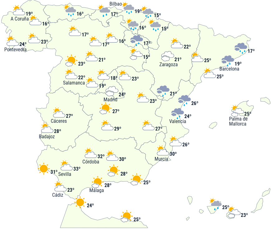 Temperaturerne vil have en nedadgående tendens på Den Iberiske Halvø og De Baleariske Øer, med mulighed for markant fald på den nordlige halvdel. Det er dog lige bortset fra Alborán-området, hvor de vil stige, og det endda markant nogle steder. Sevilla og Málaga kan således få helt op til 35 grader.