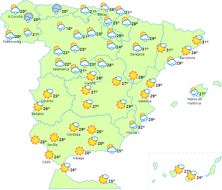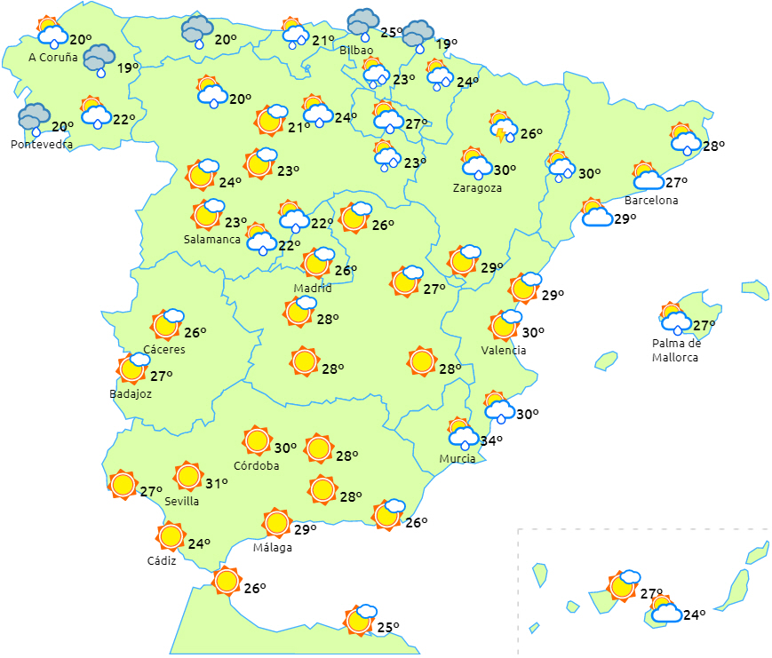 Skyet eller overskyet med i perioder over den nordvestlige del af halvøen, hvor der i løbet af eftermiddagen forventes regn og lejlighedsvis tordenbyger - lokalt kraftig nedbør i bjergområderne i det østlige Asturien, Cantabrien og Baskerlandet.