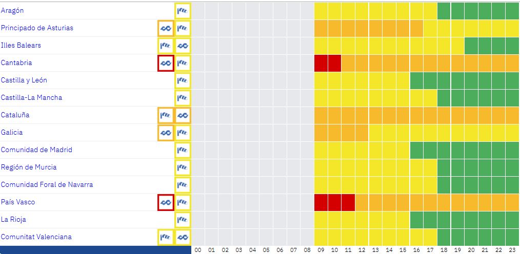 - Nedbør med sandsynlighed for at være vedvarende og lokalt kraftig i Galicien. Bemærkelsesværdigt fald i nattemperaturerne i det nordlige indland af fastlandet og lokale fald om dagen i Cantabrien.