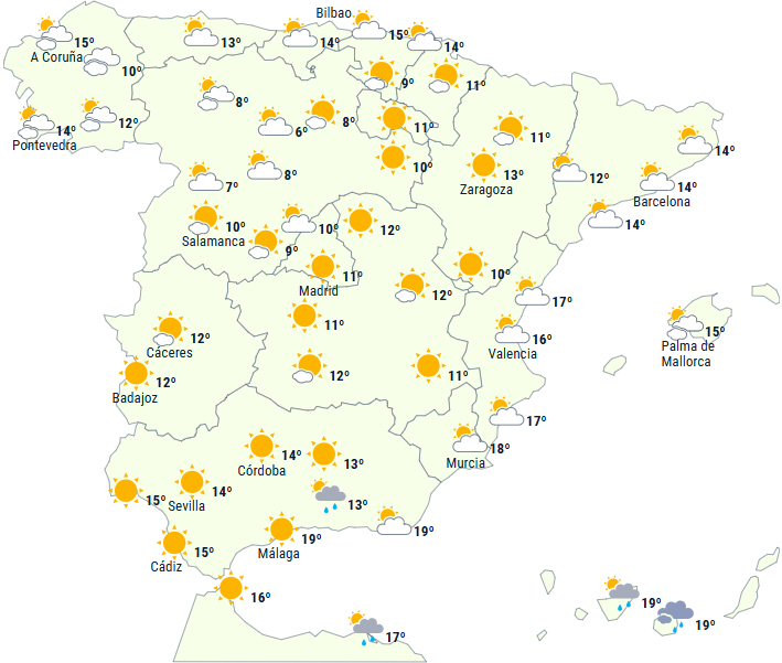 Det betyder også, at frosten bliver begrænset til svag frost i bjergene på den nordlige og sydøstlige del af Den Iberiske Halvø, og moderat frost i Pyrenæerne.