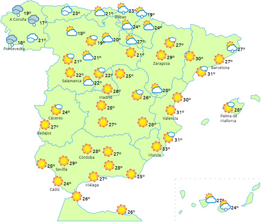 I det helt nordvestlige område giver en front mere overskyet vejr med nedbør til Galicien, som i slutningen af dagen vil brede sig til områder i den vestlige ende af nordvestkysten.
