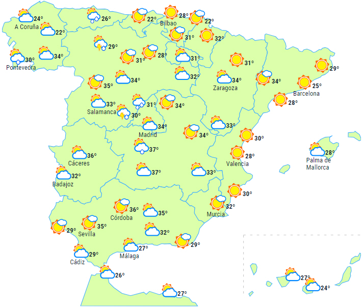 Ligeledes vil der være skyet over dele af den østlige tredjedel, det sydlige højland og de indre egne i nordvest og mulighed for lejlighedsvise byger i de østlige Pyrenæer, de iberiske og cantabriske bjerge samt noget tørt tordenvejr i Extremadura og nærliggende områder.