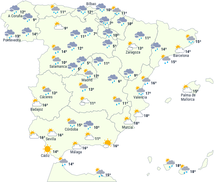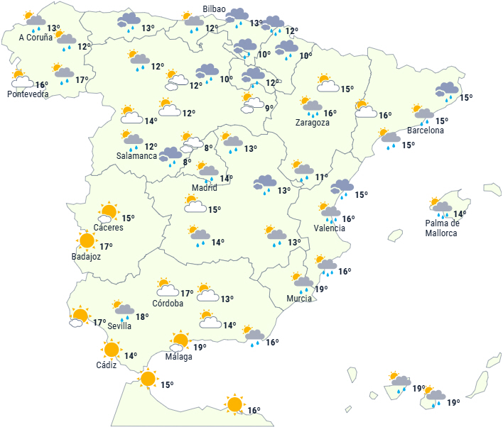 Imidlertid vil indtrængen af fugtig luft i nord og rester af ustabilitet fra de seneste dage fortsætte med at give meget skyet himmel over den nordlige halvdel med udbredt nedbør, som vil være vedvarende og moderat i det østlige Cantábrico. Det er sandsynligt, at der lokalt vil være kraftig nedbør med torden og hagl.