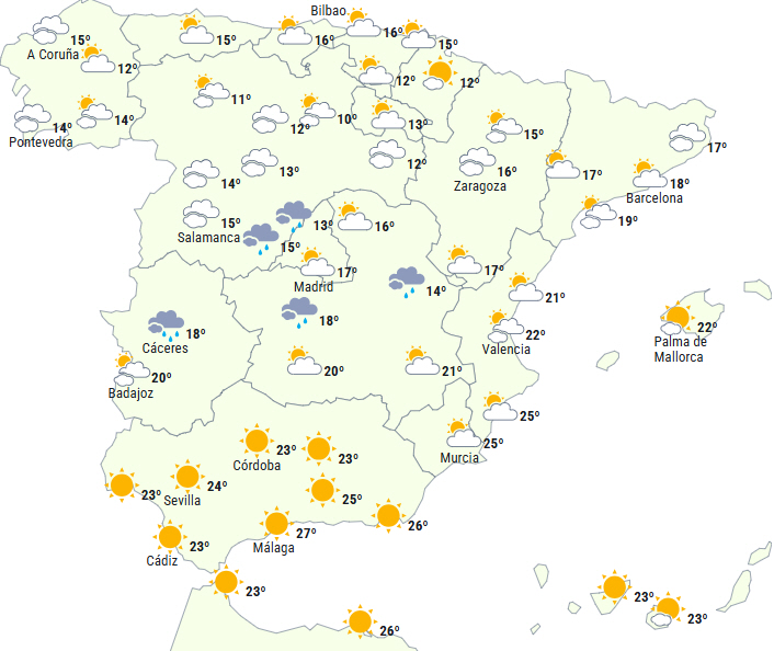 Dagstemperaturerne stiger i Andalusien, det sydøstlige indland af fastlandet, det nordlige højland og Galicien, mens de falder på resten af halvøen og De Baleariske Øer.