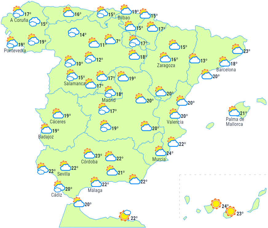 Overvejende klar eller letskyet himmel og ingen nedbør til hele landet. Der forventes dog en del lavthængende skyer over den vestlige del af Galicien, det nordlige højland, dalene i det sydlige højland, Ebro-dalen og de nordøstlige dale, hvilket sandsynligvis vil forårsage morgentåge, der er mere tæt og vedholdende i det nordlige højland.
