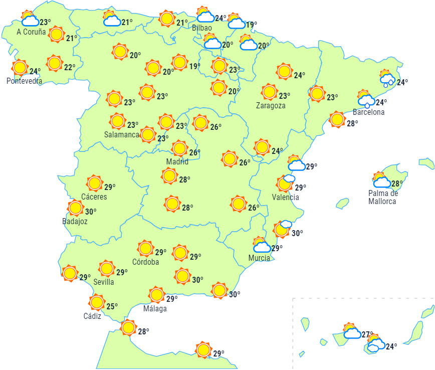 Der forventes dog skyet himmel over det cantabriske område og det nordlige Galicien, og det kan give let nedbør, der har tendens til at aftage ved kysterne om eftermiddagen.