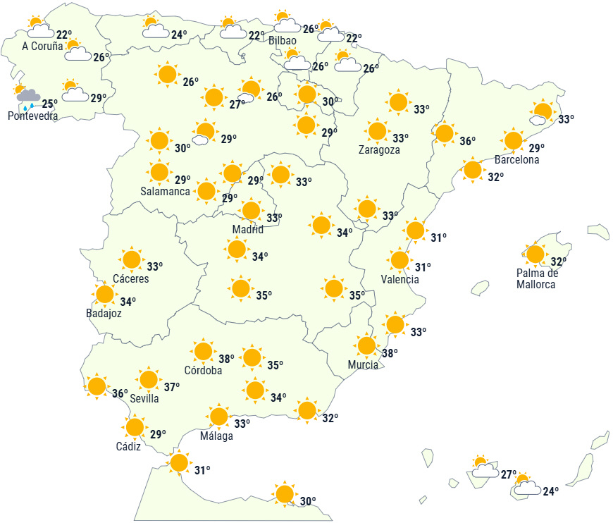 Der forventes et generelt fald i dagstemperaturerne, bortset fra lokale stigninger ved Ampurdán, det vestlige højland og i sydøst. Alligevel forventes temperaturer på 34 til 36 grader på De Baleariske Øer og i dalene på den sydøstlige og nordøstlige del af halvøen - måske endda 38 til 40 grader i Ebro-dalen.