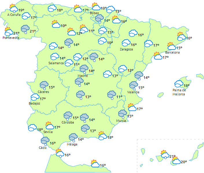 Der vil fortsat være meget ustabilt vejr på halvøen, som dog hovedsageligt vil påvirke de østlige og sydlige egne og Middelhavsområdet. Der forventes skyet eller overskyet himmel over det meste af halvøen og Balearerne med udbredt regn og byger - især i den sydøstlige tredjedel og i de centrale områder. Lokalt kan bygerne være vedvarende og/eller kraftige i området omkring Valencia, i det sydøstlige indland og i området omkring Gibraltarstrædet.