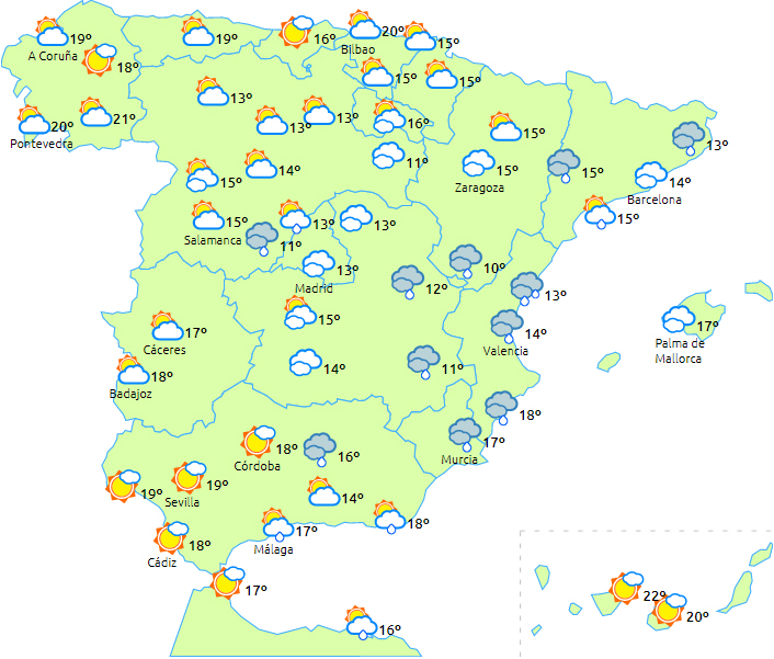 Stigende dagstemperaturer til den nordlige tredjedel og i det vestlige Andalusien, mens de falder i den sydlige del af højsletten. Minimumstemperaturerne vil stige på den nordlige tredjedel og falde på den sydøstlige del og kun frost i Pyrenæerne. Ingen større ændringer på De Kanariske Øer.