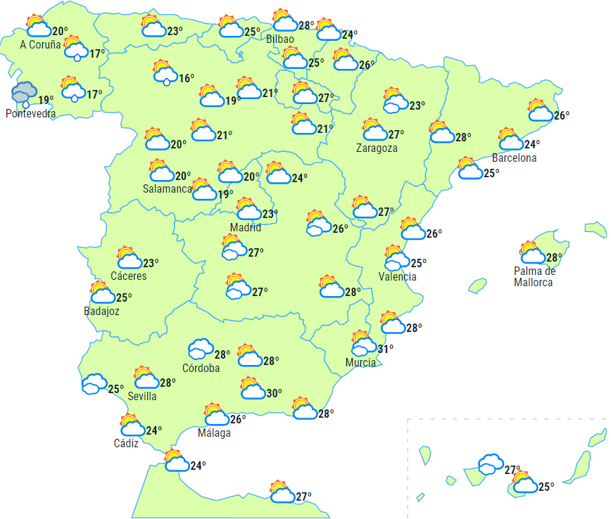 Dagstemperaturerne vil stige i Melilla, på den cantabriske kyst og i en stor del af halvøens indre egne. Nsttemperaturerne vil stige i de centrale og sydvestlige områder. Kun få ændringer i resten.