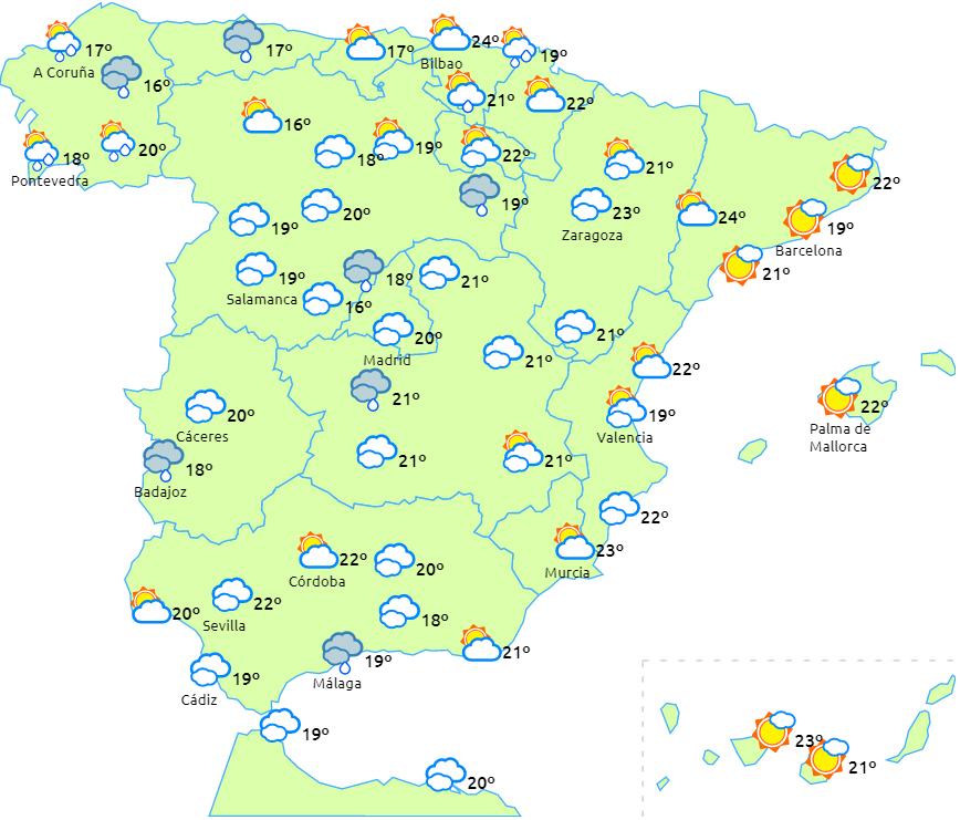 Et lavtryk vil bevæge sig fra vest mod øst og give rigeligt med skyer og sandsynlighed for byger og lejlighedsvis torden på Atlanterhavssiden og i Cantabrien. De forventes ikke at blive kraftige, men kan dog alligevel være noget kraftigere og hyppigere i de bjergrige områder i Galicien og den vestlige ende af nordvestkysten.