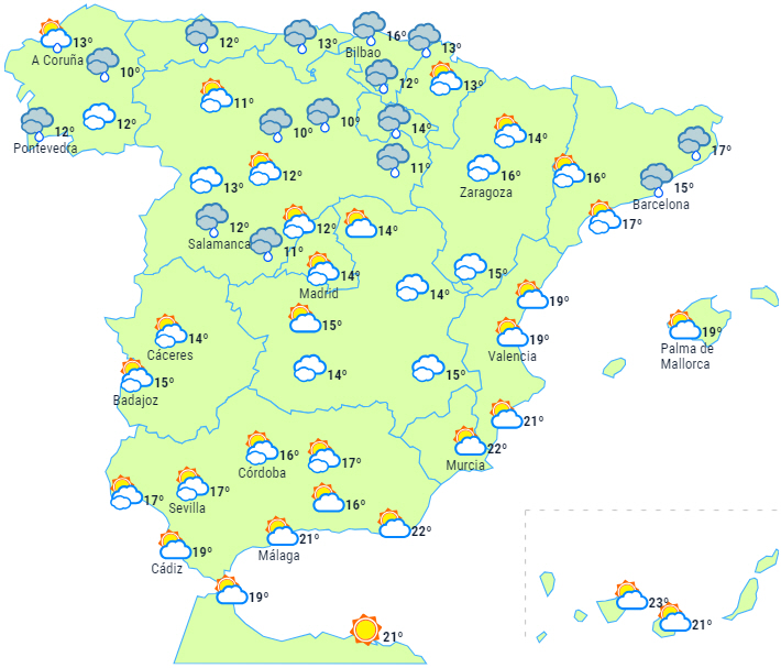 Der vil falde regn i Galicien og langs Det Cantabriske Hav, som har tendens til at tage til i styrke om eftermiddagen, hvor den breder sig til resten af den nordlige og nordvestlige tredjedel af halvøen og kan blive ledsaget af tordenvejr og hagl.