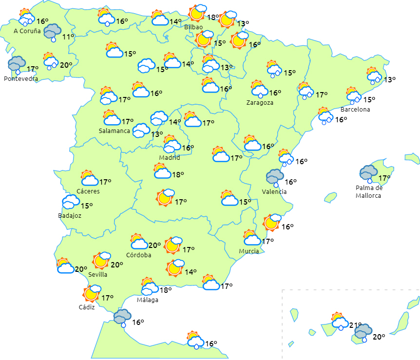 Faldende dagstemperaturer i Middelhavsområderne og på Balearerne, mens de stiger på resten af halvøen, Ceuta og Melilla. Nattemperaturerne vil generelt være faldende undtagen på De Kanariske Øer. Der forventes svag frost i de iberiske bjerge i Teruel, på den nordlige højslette og i bjergene i sydøst og nord.