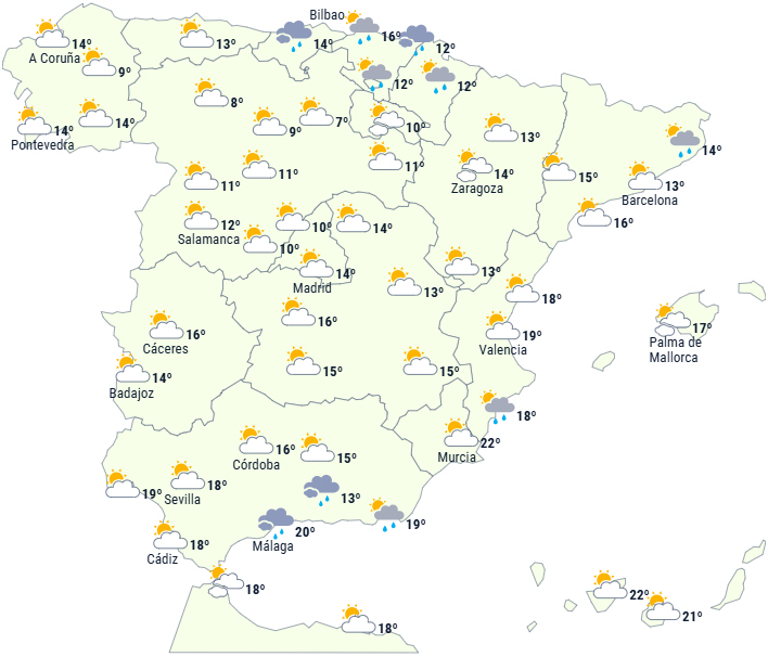 I dag forventes mere stabilt vejr efter passagen af en Atlanterhavsfront den foregående dag. Således vil resterne af fronten stadig give svag nedbør ned over De Baleariske Øer, det østlige af områderne langs Det Cantabriske Hav, Pyrenæerne og måske også i det indre og helt sydvestlige af halvøen.
