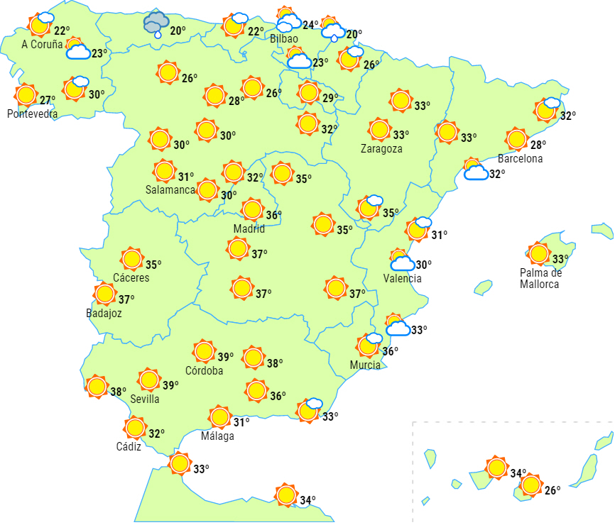 Vi vil stadig komme over 35 grader på det meste af halvøens sydlige halvdel og lokalt på De Kanariske Øer. Det forventes også at nå op på 35 i de indre dele af De Kanariske Øer, Lleida-dalen og det nedre Cinca-område og 40 i Guadalquivir-dalen. Nattemperaturerne vil generelt falde, undtagen på De Kanariske Øer.