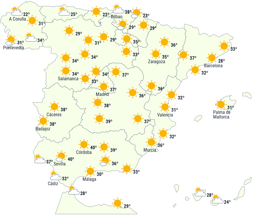 - Meget høje dagstemperaturer på den østlige tredjedel af Den Iberiske Halvø. Betydelige stigninger i dagstemperaturerne i sydvest og markante fald i områder i nordøst.