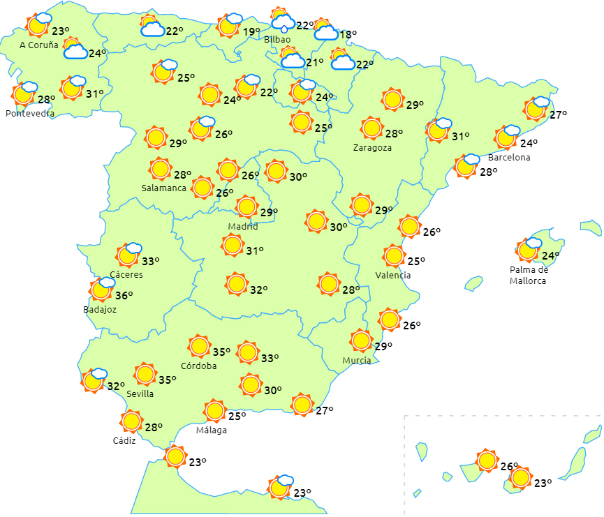 Dagstemperaturerne vil stige i næsten hele landet, men lokalt særligt mærkbart i de indre egne i nord, mens de falder i området omkring Gibraltarstrædet. Temperaturerne vil overstige 32 grader i den nedre del af Guadalquivir-dalen og i de indre dele af Huelva. Minimumstemperaturerne vil falde i det meste af landet, selv om der på den sydøstlige del af halvøen og i dalene i Huesca og Lérida kun vil være mindre fald. Svag og lokal frost er ikke udelukket i Pyrenæerne.