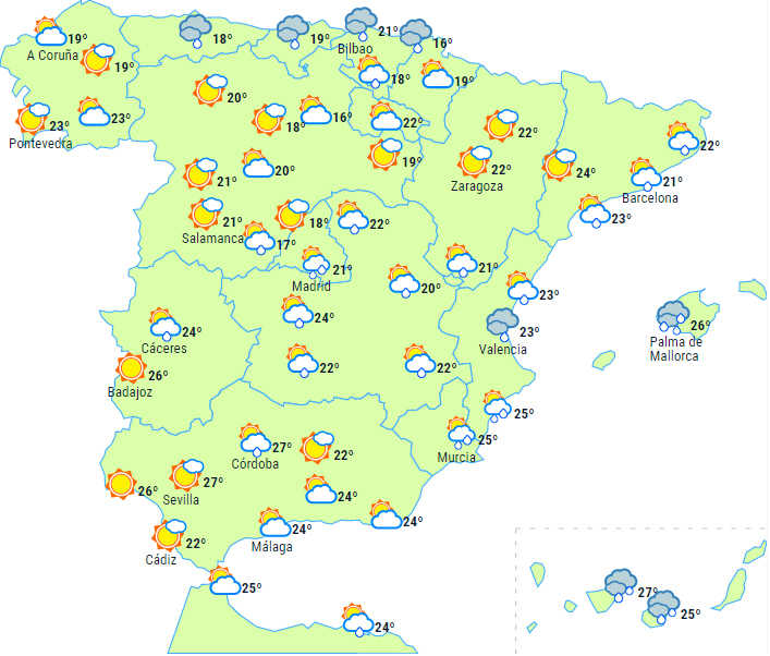 Dagstemperaturerne vil falde på den sydlige del af halvøen og stige på den nordlige halvdel. Kun få termiske ændringer på øgrupperne. Overvejende fald i nattemperaturerne - muligvis endda sæsonens første frost i Pyrenæerne.