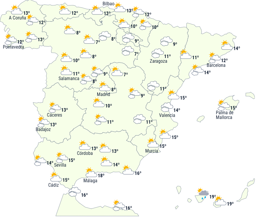 Nærmelsen af en front fra Atlanterhavet vil give overvejende skyet eller helt overskyet himmel på fastlandet med mulighed for svage og spredte byger i områder af de cantabriske og atlantiske områder, men det kan heller ikke udelukkes i Pyrenæerne mod slutningen af dagen.