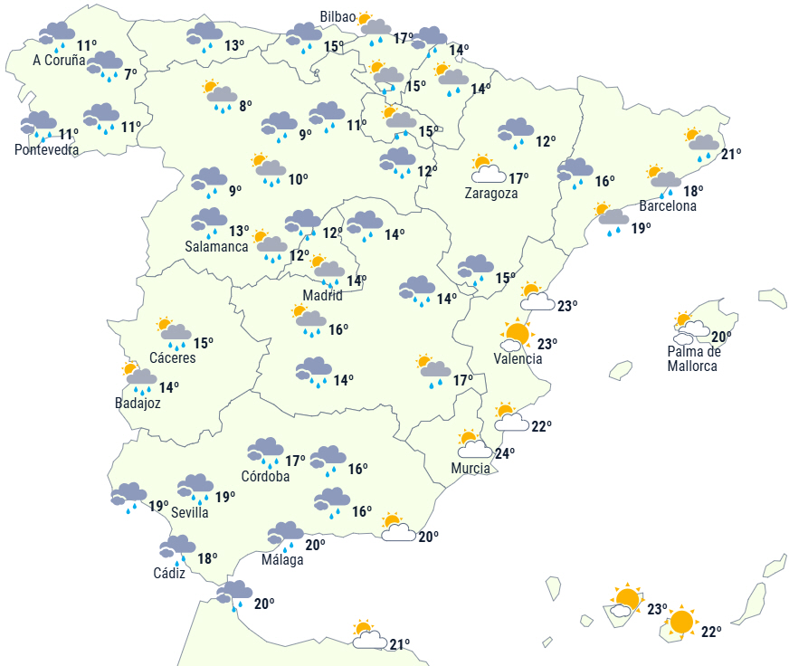 En koldfront, der er forbundet med Herminia-stormen, vil krydse halvøen i løbet af dagen og nå Middelhavet og De Baleariske Øer sidst på dagen.